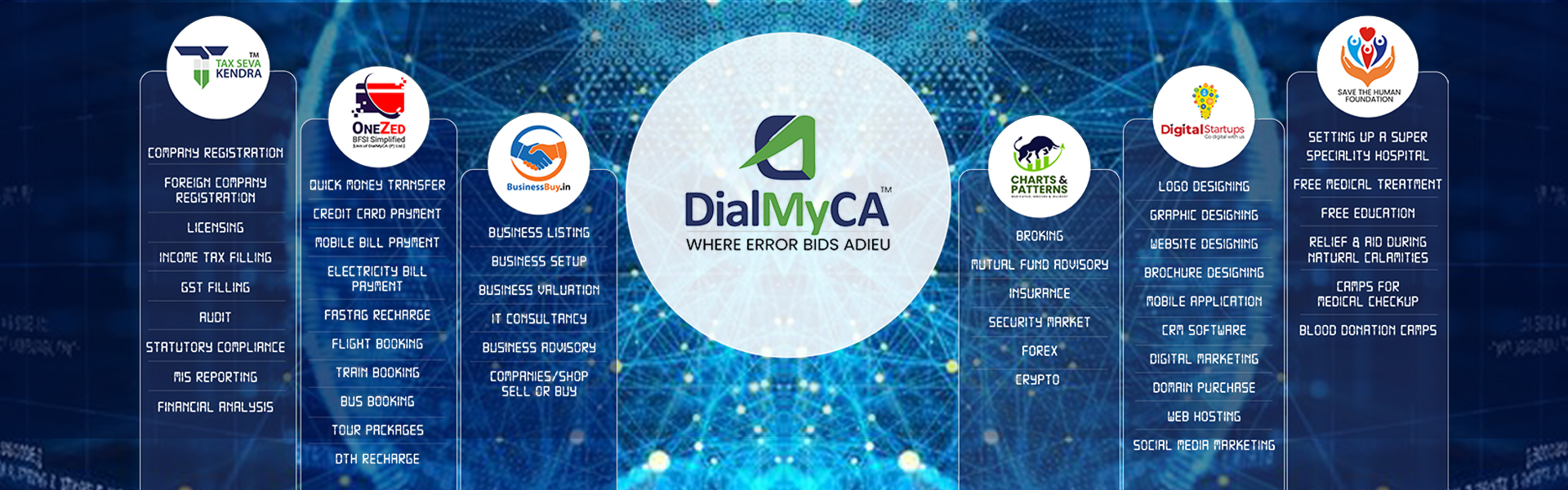 At DialMyCA Private Limited, we are committed to provide a complete business solution to our clients across India, we provide various types of digital and financial services to our users, like Accounting & Taxation services, business consultancies, Audit and Accounting services, Direct and Indirect tax regulatory compliances under the brand of “Tax Seva Kendra”, Web Designing, Graphics Designing, APP Development, Digital Marketing under the brand of “Digital Startups, Various types of financial services like Bill Payments, Recharges, Rail Air and Bus Ticket booking under the brand of “OneZed.app”